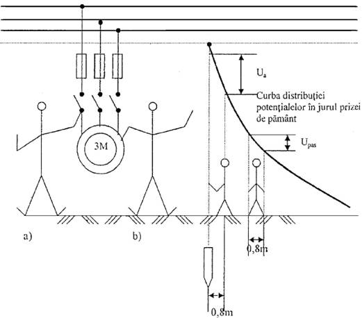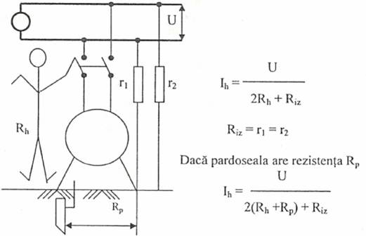 b) prin atingere indirecta, se atinge carcasa motorului electric care in mod normal nu este sub tensiune dar poate fi pusa sub tensiune ca urmare a unui defect.