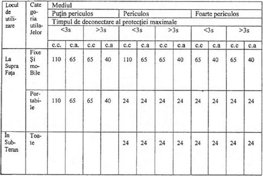Valorile maxime admise pentru tensiunile de lucru sunt date in tabelul2 Acestea se dau in functie de tipul echipamentului electric folosit si de categoria locului de munca In care acesta se utilizeaza.