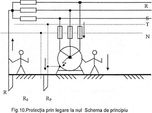 Protectia impotriva electrocutarilor prin legare la nul se foloseste pentru evitarea unor tensiuni de atingere si de pas periculoase in retelele cu nulul legat direct la pamant si cu tensiuni nominale de pana la 250V. Aceasta protectie consta in legarea tuturor partilor metalice ale echipamentelor si aparatelor, care pot fi puse accidental sub tensiune, la conductorul de nul de protectie. Ea constituie mijlocul principal de protectie si devine obligatorie daca nu este posibil sa se realizeze protectia prin legare la pamant (fig.lO).