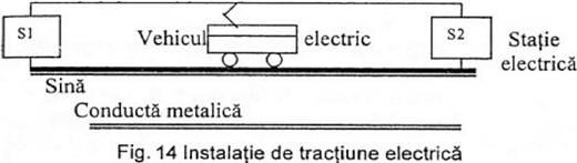 Alimentarea vehiculului electric se face din cele doua statii SI si S2 prin linia de contact si sina metalica. Apar astfel curenti vagabonzi care intersecteaza conducta metalica ingropata in apropierea sinei de rulare.