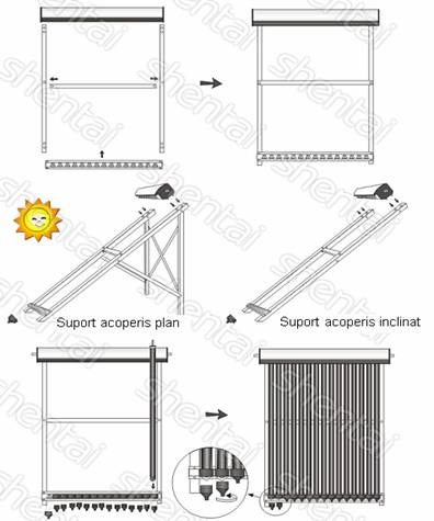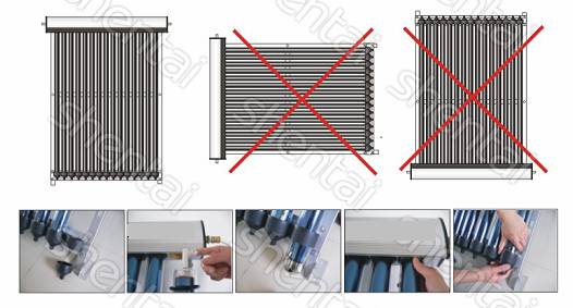 Deschideti ambalajul in care se afla atat tuburile vidate cu heat-pipe. Verificati integritatea tuburilor in vid si daca capetele acestora sunt inca argintii. In cazul in care un tub are capatul transparent sau alb inseamna ca acesta este defect si trebuie sa fie inlocuit. Fiecare tub vidat contine aripioare din metal pentru transferul de caldura. Pe masura ce scoateti din cutie tuburile vidate, montati in partea inferioara capacele de cauciuc din cutia cu restul componentelor de montaj. Acestea vor impiedica spargerea tuburilor. Nu expuneti tuburile la lumina solara inainte de instalarea lor, in caz contrar tubul din interior si aripioarele pentru transferul caldurii pot deveni foarte fierbinti. Sticla de la suprafata nu se incalzeste.