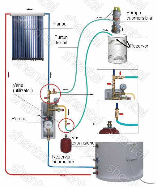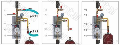 Pasul 3: conectati vasul de expansiune la vana V3. Deschideti vanele V3 si V2. Vana V4 trebuie sa fie deschisa permanent. Porniti statia solara si verificati vana de compensatie V5 pentru a vedea daca exista aer in instalatie. Daca mai exista aer in acestea, mai turnati agent termic urmand pasii de mai sus.
