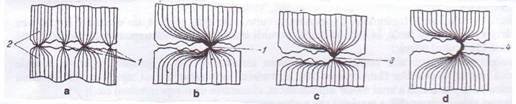a -contacte inchise :curentul electric trece prin mai multe puncte de contact ; b - contacte in curs de deschidere : a ramas un singur punct de contact care concentreaza toate liniile de curent : c - contactele in primul moment al deschiderii :curentul continua sa treaca printr-o punte de metal lichid ; d - contactele deschise :din puntea de metal lichid s-a format un arc electric : 1 - puncte de contact ; 2 - piesele de contact 3 - punte de metal lichid ; 4 - arc electric