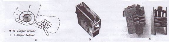 a- Stingerea arcului electric cu ajutorul campului magnetic: 1 - miez magnetic; 2- tub izolant; 3- bobina de suflaj magnetic; 4- placa polara; b- camera de stingere larga; c- vedere camera de stingere cotactor
