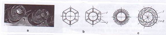 a- contacte deget masive ; b- cu contacte lamelare ; c- cu contact in 'Z' ; 1- contact mobil-tija de cupru ; 2- contact fix-degete de cupru