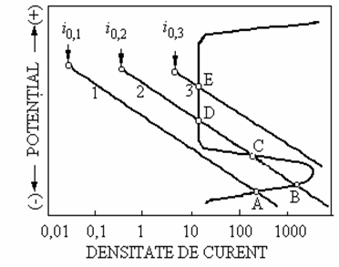 Cele trei curbe catodice reprezinta procese de reducere controlate de polarizatia de transfer de sarcina (comportare Tafel), având diferite densitati ale curentului de schimb, i0. Considerând cazul (1), aplicarea teoriei potentialului mixt (Wagner si Traud) indica existenta unui singur potential stabil în punctul A, în care este îndeplinita conditia ca viteza totala de reducere sa fie egala cu viteza totala de oxidare. În cazul (2) exista trei puncte (B, C si D), în care este îndeplinita aceasta conditie. Totusi, punctul C nu reprezinta o stare stabila, fiind situat în domeniul de tranzitie. Deci, numai potentialele corespunzatoare punctelor B si D sunt stabile pentru acest sistem. Punctul B este situat în domeniul activ si corespunde unei viteze de coroziune ridicate, în timp ce punctul D este situat în domeniul pasiv si viteza de coroziune corespunzatoare este foarte mica. Pentru cazul (3) exista un singur potential stabil, corespunzator punctului E, situat în domeniul pasiv.