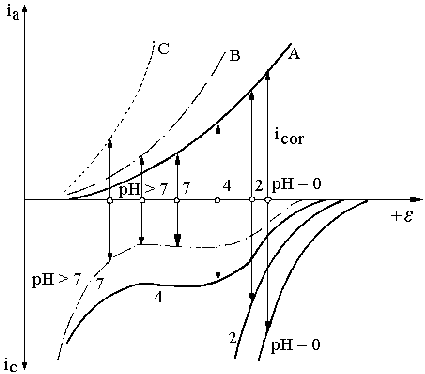 Curba de polarizatie anodica partiala A corespunde cazului când viteza de dizolvare a metalului nu depinde de pH si potentialul de coroziune se deplaseaza spre valori mai negative simultan cu scaderea vitezei de coroziune odata cu cresterea pH-ului. La pH 7 viteza de coroziune este data de curentul limita de reducere al O2 deoarece curentul limita de reducere a ionilor H+ este neglijabil.