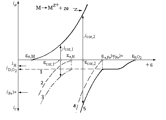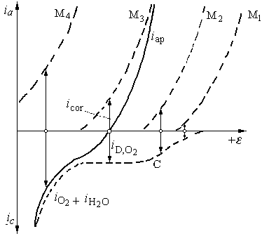 În fine, curba M4 corespunde cazurilor când potentialul de coroziune este suficient de negativ, când alaturi de reducerea O2 are loc si degajarea H2 din apa, ceea ce va intensifica viteza de coroziune, cu deosebire în solutii alcaline.