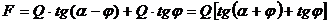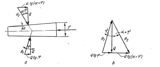 In figura 4 se reprezinta sistemul fortelor intr-o imbinare cu pana inclinata. Forta de batere F va trebui sa invinga fortele de frecare dintre pana si butuc, respectiv dintre pana si arbore, precum si componenta orizontala data de inclinarea penei. Pentru echilibru, dupa ce s-a inlocuit coeficientul de frecare µ cu unghiul de frecare φ, forta de batere a penei F va fi: