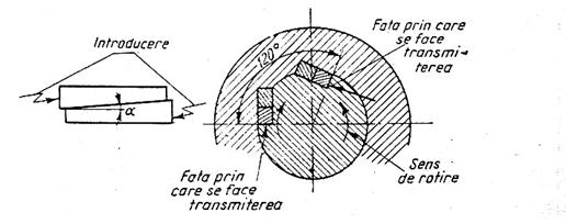 - canalul de pana din arbore si cel din roata au o forma care tine seama de sensul de rotatie. Pentru a transmite miscarea in ambele sensuri trebuie executate doua canale de pana, Ia intervalul de 120° si in sens opus ;