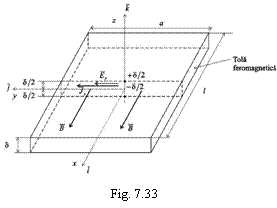 Pentru aceasta se considera o tola feromagnetica de forma unei lamele, asa ca īn figura 7.33, avānd o grosime δ foarte mica īn raport cu celelalte doua dimensiuni (l si a , care pentru exemplul din figura 7.32 este a=2r(z), avānd īn vedere forma circulara a conturului miezului): δ<<l ∩ δ<<a.