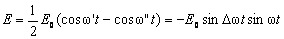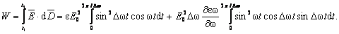 Pentru ca cele doua pulsatii, ω' si ω", difera putin īntre ele prin ipoteza (adica ε' - ε" = 2Δω << ω), termenii sinΔωt si cosΔωt variaza lent īn timp, spre deosebire de sinωt si cosωt care variaza rapid, astfel īncāt prima integrala a expresiei (7.9-9) poate fi considerata nula. Cea de-a doua integrala din (7.9-9), īn care se īnlocuieste sin2ωt prin valoarea sa medie ½, devine: