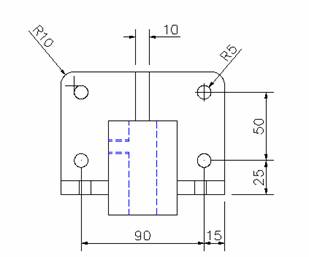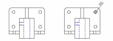 22. Selecta\i din nou op\iunea radius si alege\i raza de rotunjire a col\ului din stanga sus a piesei turnate. Pozi\iona\i textul la aproximativ 30 mm ]n afara piesei (vezi figura 17). Se observ[ c[ se marcheaz[ automat centrele cercurilor si axele de simetrie.
