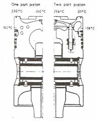 Pentru varianta dintr-o singura bucata se observa existenta unei insertii de otel in zona primelor segmenti,care sunt cei mai puternic solicitati termic.De asemenea,se asigura racirea fortata a capului pistonului.