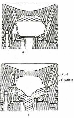 Cea mai moderna solutie de racire aplicata este aceeasi "improscare" cu ulei,mai sus mentionata.In fig 6b se observa pozitionarea uleiului de racire, in cazul situarii pistonului la punctul mort superior (P.M.S.) respective la punctul mort inferior (P.M.I.).