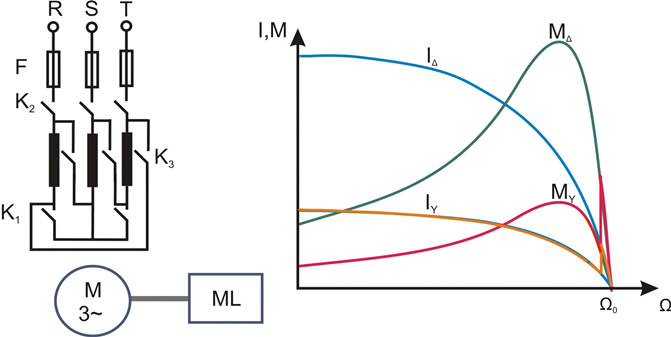 Observatie: Metoda de pornire stea-triunghi ofera avantajul ca permite reducerea tensiunii si in timpul functionarii la sarcini reduse (mai mici de 1/3 din valoarea nominala), imbunatatindu-se astfel factorul de putere si randamentul