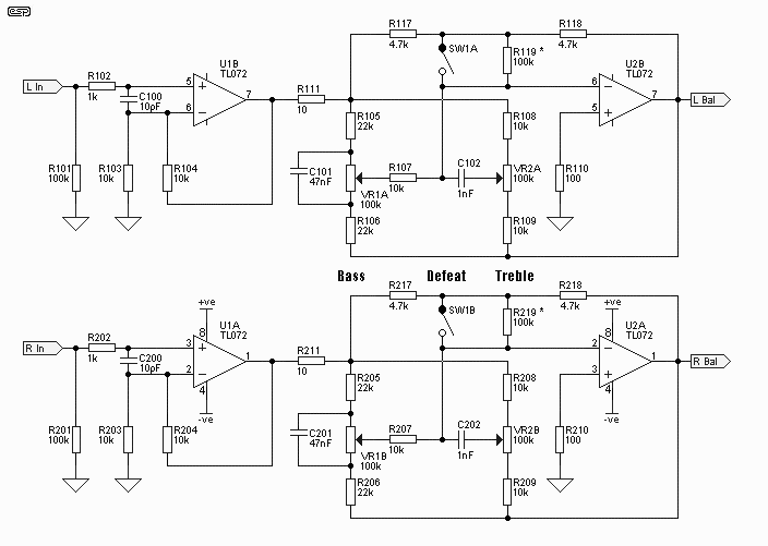 The input stage is configured as shown with a gain of 2 times (6dB), and also acts as a buffer for the tone control circuit. The tone control is a basic Baxandall type, 20120e420u but the addition of R117, 118 and 119 provide flexibility and easy reconfiguration that is not available with the traditional arrangement.