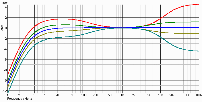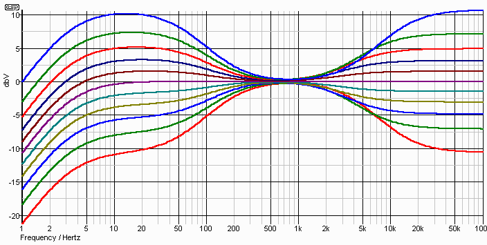 R119 is the tricky part in this circuit (which is unique, by the way - I have not seen this technique used before). As shown it is 100k, and this limits the tone control range to a sensible +/-10dB. To obtain more boost and cut, R119 (and R219) may be omitted altogether. Conversely, reducing the value will give a smaller range, with about 6dB at 20Hz, and 7.5dB at 20kHz with 22k.