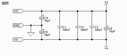 ceramic 100nF caps and 10uF electros are used for RF stability as usual. These are essential, and especially so where high speed opamps are used.