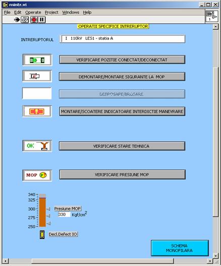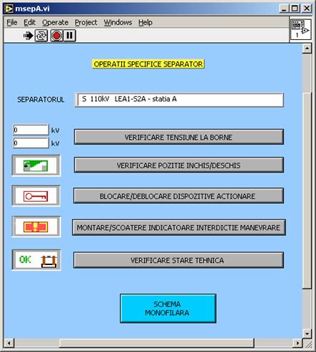Īn dreptul fiecarui element de comutatie este prevazut cāte un buton mic galben care permite accesul īn fereastra de operatii specifice corespunzatoare elementului respectiv.