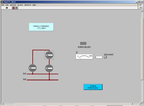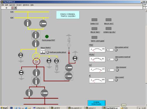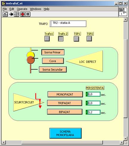 De exemplu prin actionarea butonului care are inscriptionata eticheta TRAFO1 se deschide fereastra corespunzatoare panoului de comanda pentru transformatorul de putere numarul 1.
