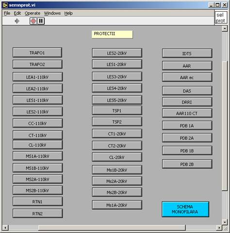 Prin actionarea butonului PROTECŢII se deschide fereastra care contine butoanele de legatura catre toate panourile de protectii simulate.