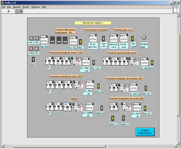 De exemplu prin actionarea butonului care are inscriptionata eticheta TRAFO1 se deschide fereastra corespunzatoare protectiilor pentru transformatorul de putere numarul 1.
