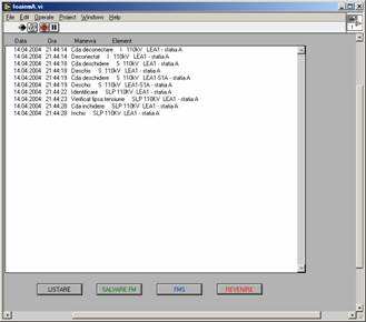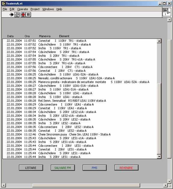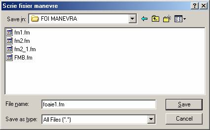 In caseta de afisare apar data, ora, manevra si eticheta echipamentului asupra caruia s-a executat manevra respectiva. se salveaza manevrele efectuate prin apasarea butonului SALVARE FM apare fereastra "Scrie fisier manevre" ; se alege subdirectorul FOI MANEVRE , se introduce un nume pentru foaia salvata (ex. Foaie1.fm) si se apasa butonul Save pentru salvare.