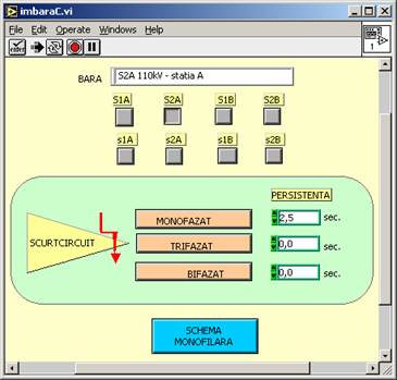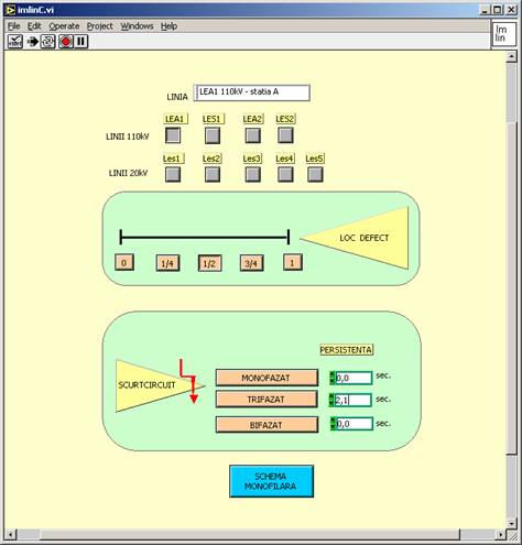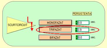 Fig.2.8. Scurtcircuite linii - selectia tipului de scurcitcuit si a persistentei Dupa īnscrierea persistentei se apasa butonul reprezentānd tipul scurtcircuitului selectat. Din acest moment se declansaza scurtcircuitul, iar valoarea persistentei se decrementeaza pāna la 0 (zero), moment īn care se considera ca scurtcircuitul a disparut. Introducerea defectelor mecanice la īntreruptoare se face īntr-o fereastra de forma celei prezentate la punctul 1.7 - fig.1.4. Prin selectia