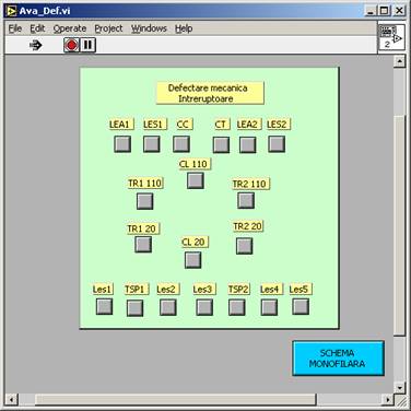 Fig.2.5. Meniul principal - butoane de introducere avarii si defecte Prin actionarea unuia din butoanele din meniu se deschide fereastra corespunzatoare care permite utilizatorului sa introduca avarii sau defecte. Ferestrele de introducere avarii si defecte sunt prezentate la punctul 1.8 - fig.1.16 - 1.20. Utilizatorul are posibilitatea sa aleaga instalatia sau elementul care se defecteaza prin apasarea pe butonul corespunzator. Butonul este cu retinere. Daca se doreste selectarea unei alte instalatii sau unui alt element din fereastra trebuie mai īntāi sa se apese primul buton pentru revenire, dupa care are efect apasarea pe noua selectie. De exemplu, pentru introducerea unui scurtcircuit pe LEA1 -110kV, se apasa butonul aferent, īn fanta de deasupra īnscriindu-se numele liniei selectate (vezi fig.2.6). Īn continuare trebuie selectat locul unde se produce scurtcircuitul: la unul din capetele liniei la ¼ sau ½ sau ¾ din lungimea liniei