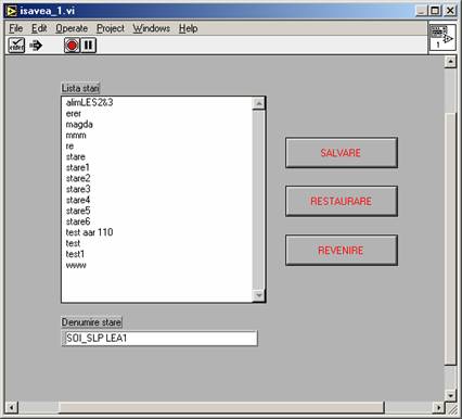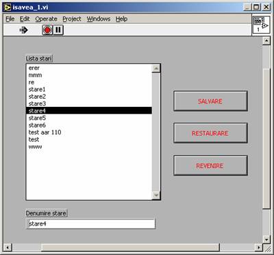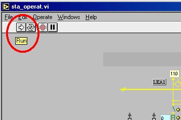La partea superioara a ferestrei sub meniul standard al aplicatiei Labview este asezata o bareta cu butoane de lucru pentru gestionarea aplicatiei de simulare. Butoanele de pe aceasta bareta permit utilizatorului: