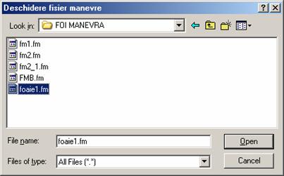 Exista doua moduri de lucru si anume: "Editare FMS" "Evaluare FM" a. Modul de lucru "Editare FMS" (butonul EvaluareFM/EditareFMS pozitionat īn dreapta) Acest mod de lucru are ca interfata grafica utilizator imaginea prezentata mai sus. Īn acest mod de lucru, prin actionarea cu mouse-ul a butonului "INCARCARE FM (din partea de jos a imaginii de mai sus) se īncarca datele salvate anterior īn directorul FOI MANEVRA (ex . Foaie1.fm ) prin apasarea butonului Open.