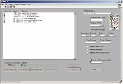 Prelucrarea se face astfel : - se acorda ponderi prin introducerea de valori numerice ( 0.100) īn casetele aferente criteriilor de evaluare. Casetele sunt etichetate cu numele "Corectitudine", "Disciplina", "Scop", "Durata" Observatie: Suma ponderilor trebuie sa fie 100. - se ia pe rānd fiecare manevra (se pozitioneaza cursorul mouse-lui pe ea) si i se stabileste tipul ("Deosebit de Importanta"," Importanta" sau "Neimportanta din punct de vedere al succesiunii" īn partea dreapta a ferestrei, prin clic de mouse pe cercul din stānga textului. se acorda un punctaj fiecarei manevre tinānd cont de importanta acesteia se stabileste nr. punctelor cu care se face depunctarea pentru manevrele neimportante īn succesiune care sunt executate īn plus sau īn minus de operatorul cursant se stabileste timpul maxim alocat temei de instruire . Dupa prelucrarea foii de manevre instructorul salveaza datele prin actionarea cu mouse-ul a butonului SALVARE FMS Salvarea se face īn subdirectorul FMS, fisierul avānd extensia *.fms (ex. Foaie1.fms).