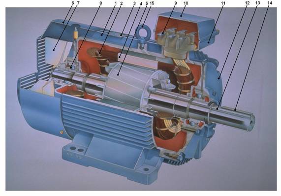 Fig. 3.1. Principalele elemente constructive ale motorul asincron cu rotor in scurtcircuit (colivie) de uz geneal: 5. rotor in colivie; 6. capota ventilator; 7. ventilator; 8. rulment cu bile; 9. inele/lamele de contact; 10. capac cutie borne; 11. cutie borne; 12. scut portlagar; 13. ax (arbore) motor; 14. pana cap ax; 15. inel ridicare. |