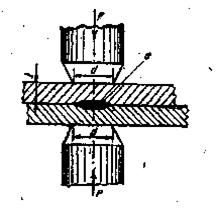 Sudarea in puncte din doua parti (fig. 3) se executa priu presarea tablelor de sudat 1 si 2 cu o forta P intre doi electrozi 3 si 4, care actioneaza pe ambele parti, fiind conectati la secundarul unui transformator de sudare 5, prevazut cu comutatorul de prize 6. Transformatorul este racordat la reteaua de alimentare prin intermediul unui contactor mecanic comandat de sistemul de comanda 8 care asigura programarea curentului prin elementul 7 si a fortei prin elementul 9.