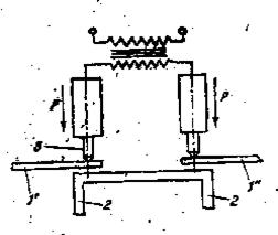 Sudarea in puncte dintr-o singura parte (fig. 6). In cayul acestui procedeu piesele de sudat 1' si 1" preseaza pe suportul 2 cu ajutorul electrozilor 3 Piesele 1' si 1" nu se afla in contact electric direct, de aceea curentul secundar strabate contactele stabilite intre 1' si 2 si 2 Procedeul se aplica tablelor din otel cu grosimi de pana la 2,5 mm.