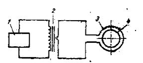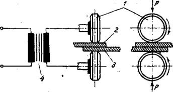 Echipamentul de inalta frecventa 1 alimenteaza, prin circuit de incarcare, primarul unui transformator 2, iar secundarul transformatorului alimenteaza inductorul 3, in interiorul caruia se plaseaza pisa de sudat 4.