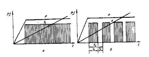 Regimul caracterizat prin valori constante pentru curent si forta de apasare (fig. 8, a). Aceasta varianta prezinta dezavantajul supraincalzirii suprafetei de contact, de aceea este mai putin folosita. Supraincalzirea se datoreste propagarii caldurii cu o viteza mai mare decat viteza de sudare.