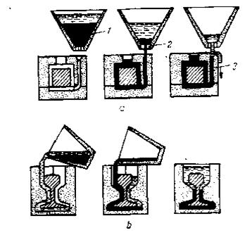 In cazul sudarii cu termit prin topire (fig 13.a), metalul topit 1 din oala de turnare se toarna prin orificiul 2, intr-o forma 3 care inconjoara rostul pieselor de sudat. Oxidul de aluminiu (A1203, avand greutatea specifica mai mica, mentine la suprafata metalului topit astfel ca nu vine in contact cu piesele sudate.