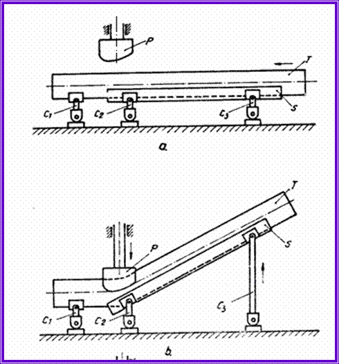 introducerea tevii T pe suportul S, cricurile C1, C2 si C3 fiind reglate la aceeasi înaltime, a.î. teava T sa stea în pozitie orizontala - a;