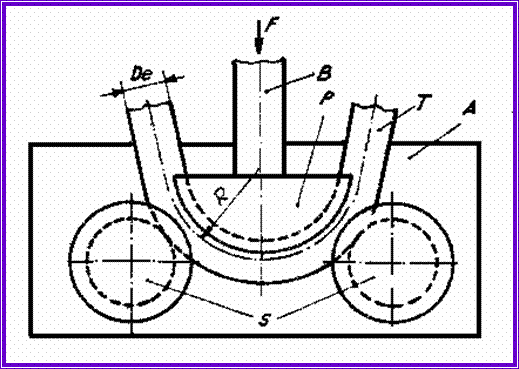 poansonul, împins cu forta F de berbecul B, îndoaie teava T, sprijinita pe doua role profilate S, montate pe batiul presei A.