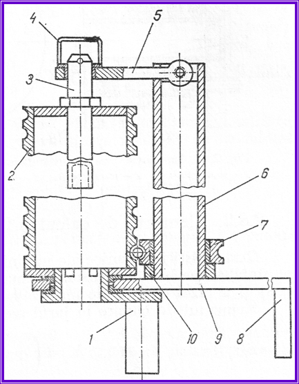 antrenarea în miscare de rotatie a tamburului profilat 2 este asigurata de arborele principal al unui strung, prin intremediul manivelei 1;