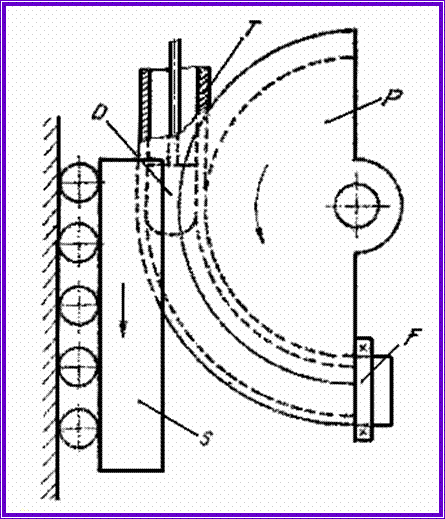 teava T, ghidata de sablonul S, se înfasoara în jurul sectorului profilat P;