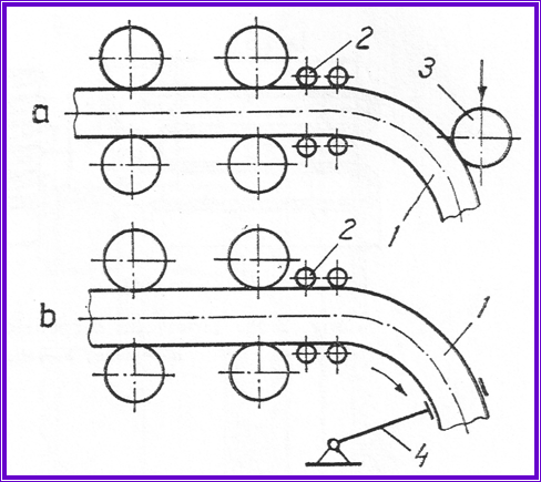 rola deformatoare 3 (fig. a) sau dispozitivul de curbare uniforma 4 (fig. b), actionând asupra portiunii încalzite a tevii, o curbeaza la raza dorita;