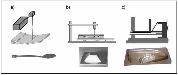 Fig. 2. Procedee mai noi pentru deformarea incrementala a tablelor a) deformarea cu fascicul laser; b) deformarea cu jet de apa; c) deformarea tablelor cu CNC |