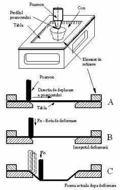 - realizarea prin deformare plastica la rece, a unor cavitati de diferite forme si dimensiuni în piesele din tabla, fara utilizarea unor placi active si poansoane de complexitate ridicata, pentru o productie de serie mica sau unicat;