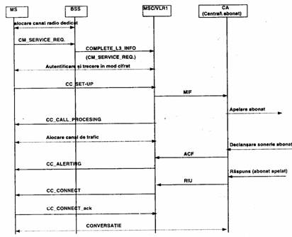 Īn acest caz initiatorul este un abonat mobil, iar procedura de gestionare a apelului mobil -> retea fixa implica subnivelele MM, RR, CC din statia mobila. Īn figura 1 sunt prezentate mesajele de semnalizare schimbate īntre diverse entitati implicate īn aceasta procedura.