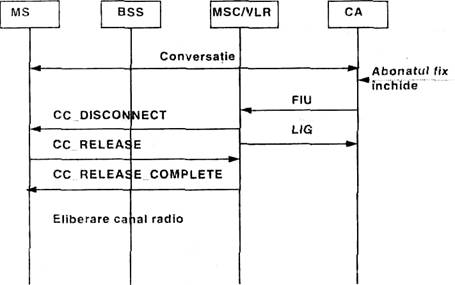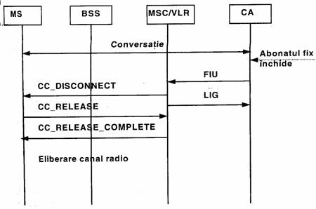 - eliberarea canalului de trafic alocat mobilului pentru comunicatia mobil <-> BSS (atāt pe sensul ascendent, cat si pe sensul descendent). Primul caz (comunicatia este īncheiata de abonatul fix) este prezentat īn figura 2, iar cel de-al doilea īn figura 3.