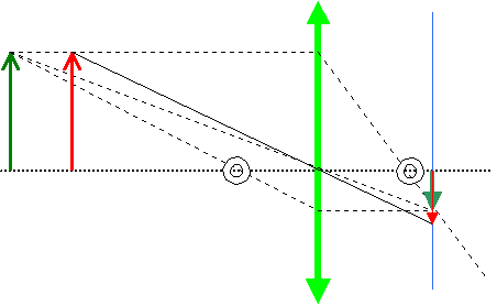 imaginea neclara, reprezentata prin sageata rosie. Cu cāt distanta dintre obiectul verde (focalizat) si cel rosu