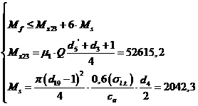 30) Se verifica cele 6 suruburi d19 la solicitarea la forfecare provocata de momentul de frecare in filet Mf - calculat la punctul 7, la preluarea momentului Mf participa si momentul de frecare pe suprafetele (z2+z3), notate Mz23: